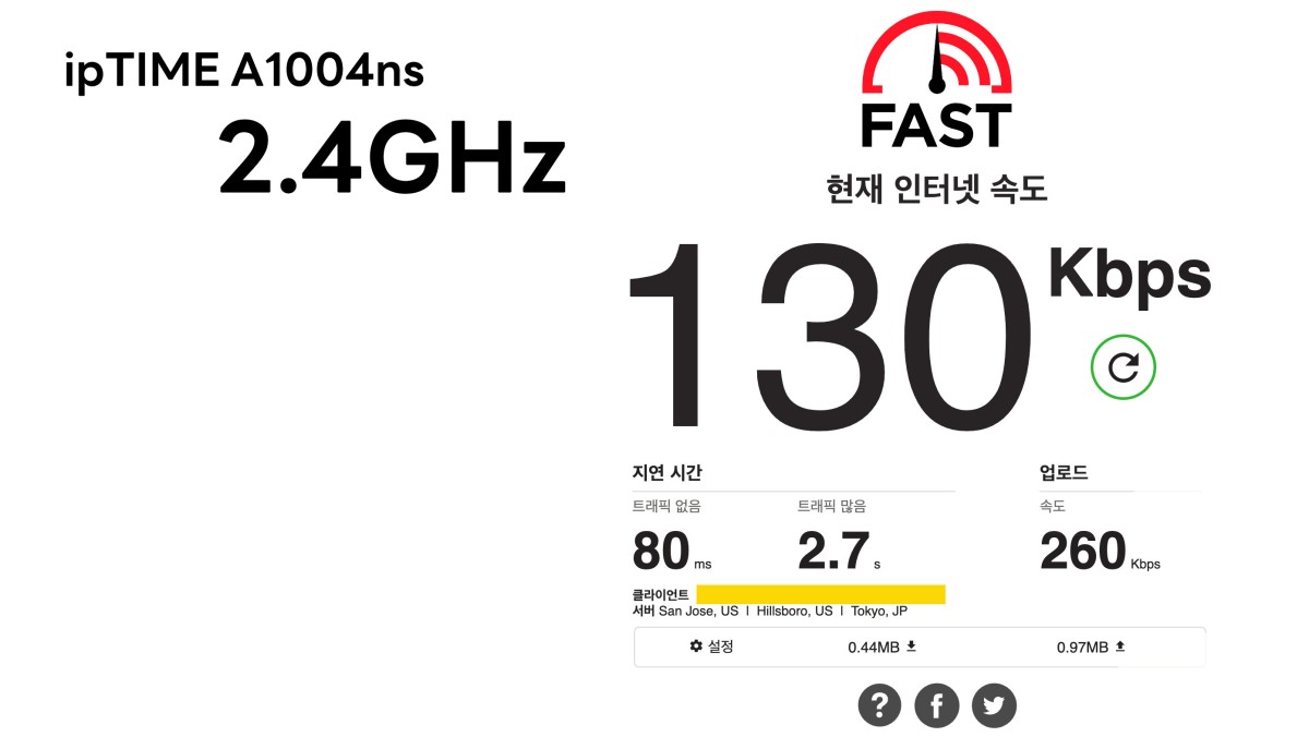 ▶︎ ipTIME A1004ns 5G / 2.4GHz 둘다 잘 잡혔으나 속도가 현저히 떨어졌습니다. 테스트를 진행했던 맥북(MacBook) 에서 NIA 한국정보화 진흥원 접속이 원할치 않아 하단의 FAST.COM 사이트에서 테스트 했던 관계로 정확한 비교는 안되기 때문에 두 제품을 비교하기엔 부족한 면이 있을 것 같으니 참고만 해 보시기 바랍니다. 역시나 고객님의 시간을 많이 빼앗을 수 없어 빠르게 다시 고객님 댁 으로 방문해 아이피타임(ipTIME) 제품을 제거하고 아수스(ASUS) 제품으로 교체 후 다시 공원으로 나가 테스트를 진행하였습니다.